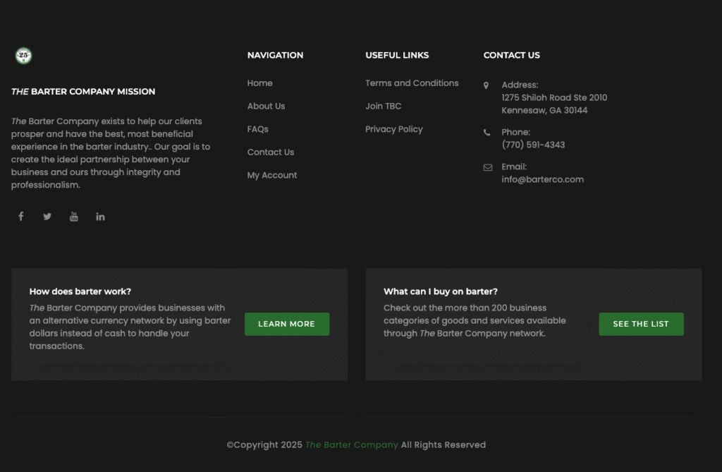 The Barter Company (TBC) is a recognized leader in the barter industry and is the largest, fastest growing barter exchange in the Southeast with offices in Georgia and Florida. We provide businesses with an alternative currency network by using barter dollars instead of cash to handle your transactions. We help business get new customers, increase profits and save cash while acting as a third party records keeper, providing clients with monthly statements that reflect all barter purchases, sales and current barter dollar balance.